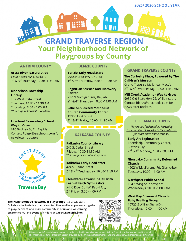 Playgroups are a vital part of the Great Start Collaborative and Family Coalition’s initiative to support early childhood development and family engagement in the Traverse Bay area. These playgroups are designed to provide a welcoming and safe environment where young children can explore, learn, and grow through play, while parents and caregivers connect, share experiences, and access valuable resources.