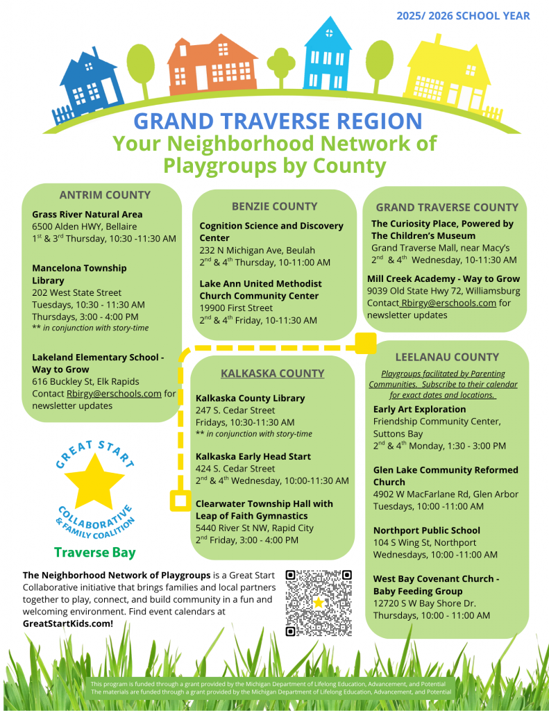 Playgroups are a vital part of the Great Start Collaborative and Family Coalition’s initiative to support early childhood development and family engagement in the Traverse Bay area. These playgroups are designed to provide a welcoming and safe environment where young children can explore, learn, and grow through play, while parents and caregivers connect, share experiences, and access valuable resources.